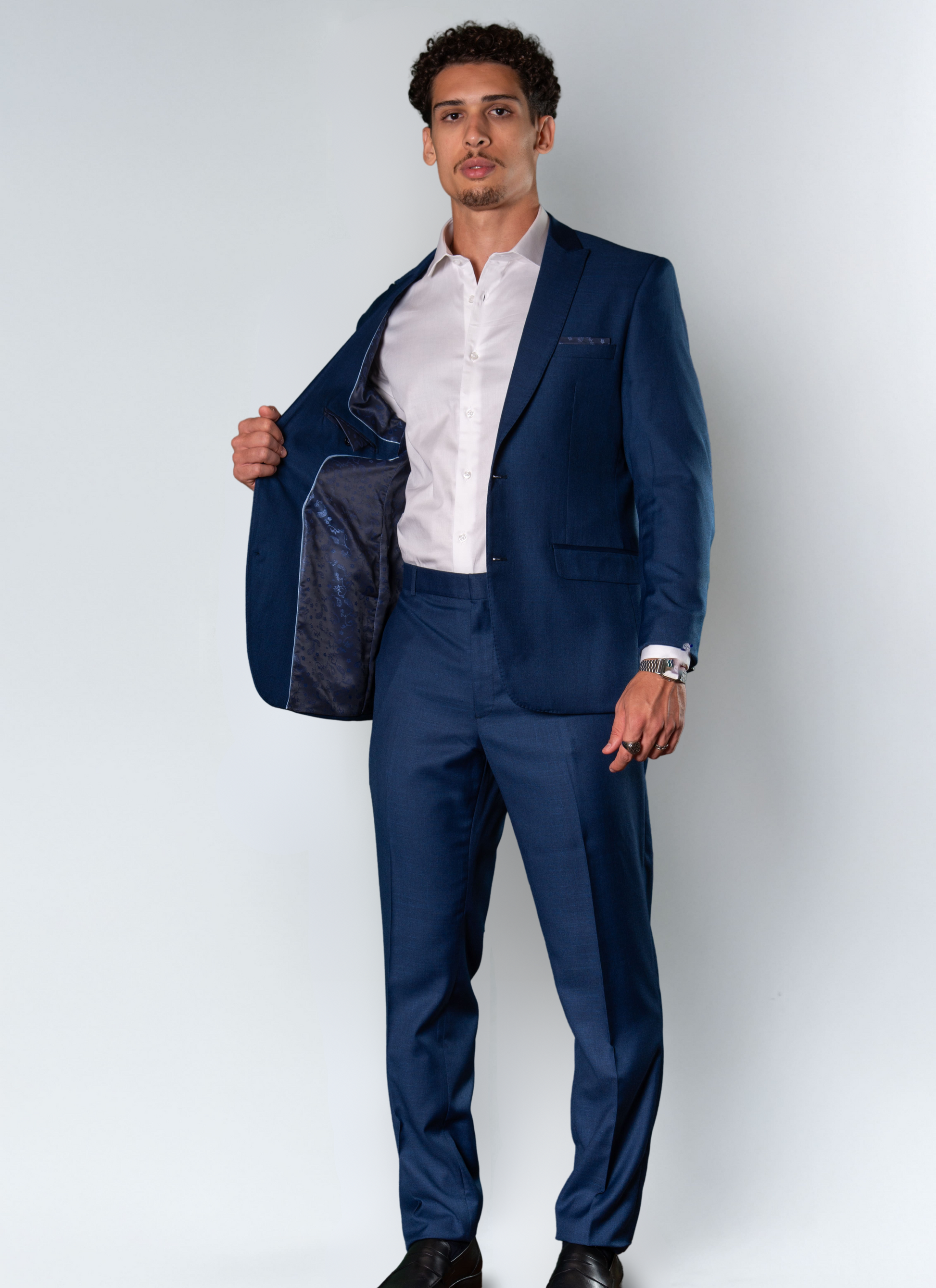 Confeccionado em tecido que combina poliéster, viscose e elastano, este traje slim oferece caimento elegante, leve conforto e toque suave. A composição garante conforto durante o uso, mantendo a resistência e a sofisticação características da alfaiataria.