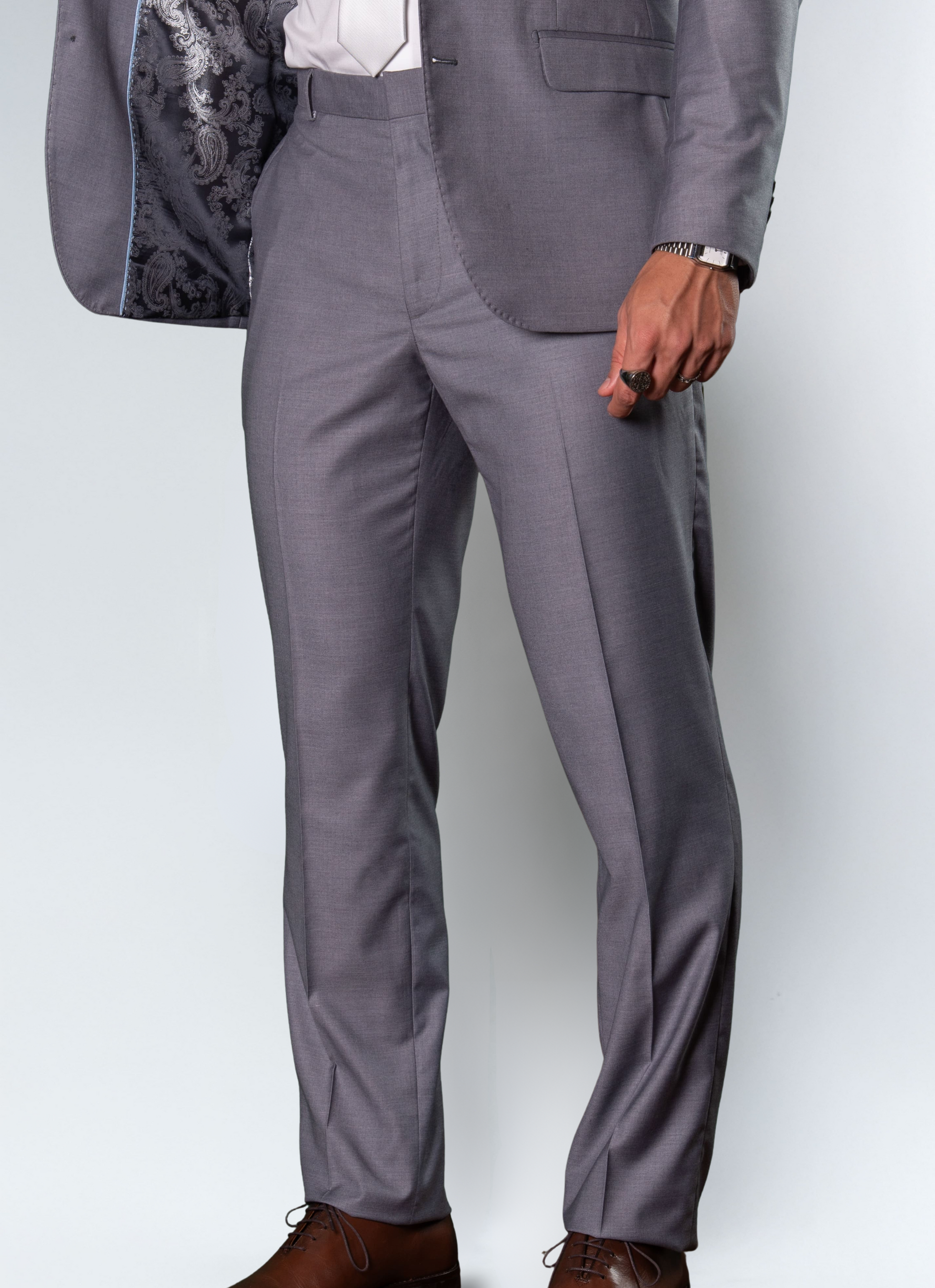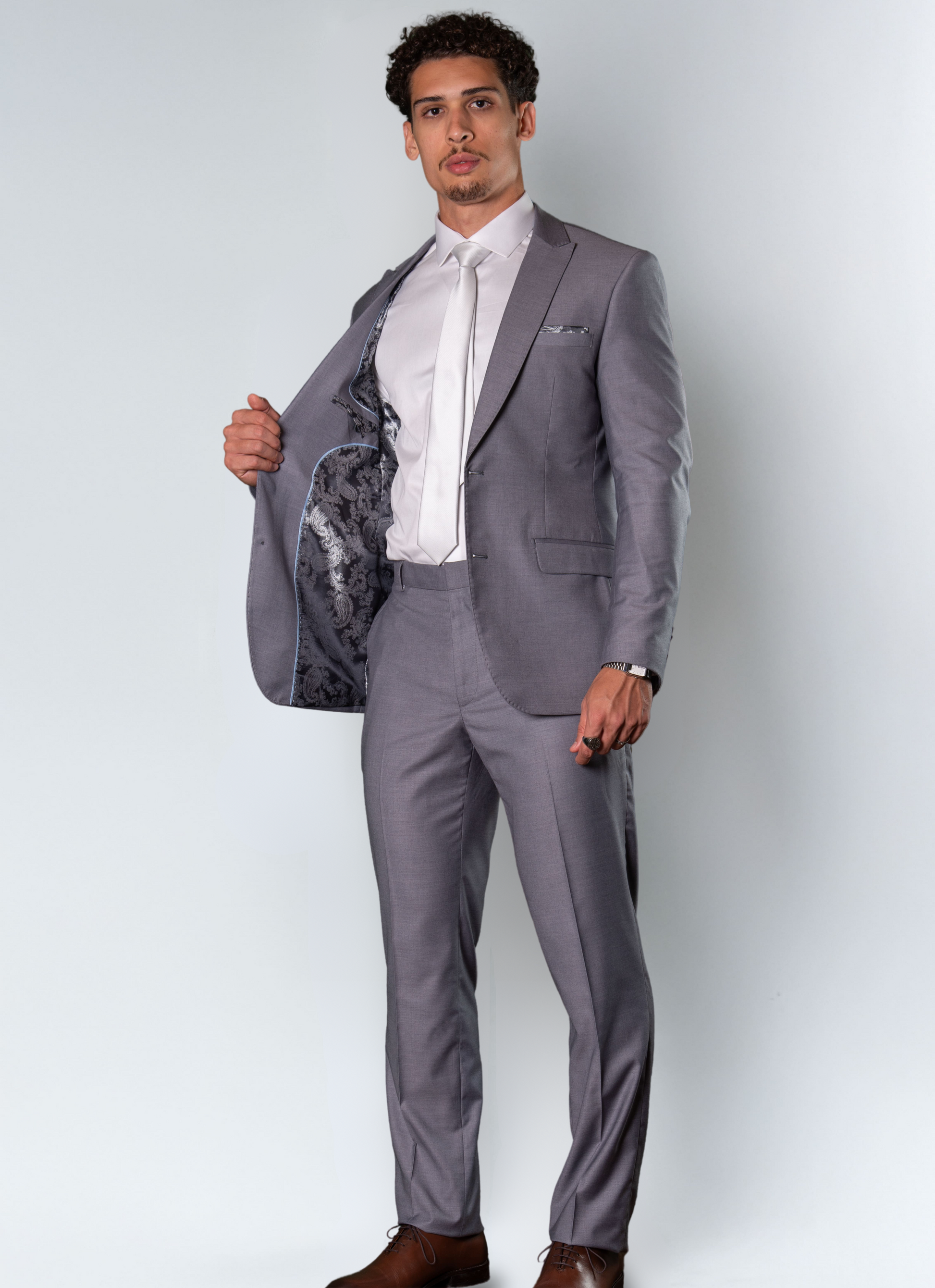 Com lapela de bico, o design reforça a modernidade contemporânea, enquanto a cor cinza claro adiciona leveza e características, ideal para eventos formais e produções profissionais que pedem presença refinada.